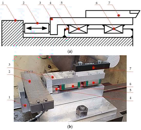 Overview of the proposed FTS drive: (a) kinematic diagram, (b) actual drive mounted on the lathe turret: (1) base, (2) piezoelectric drive unit, (3) support frame, (4) guide rail, (5) carriage 1, (6) carriage 2, (7) turning tool holder.