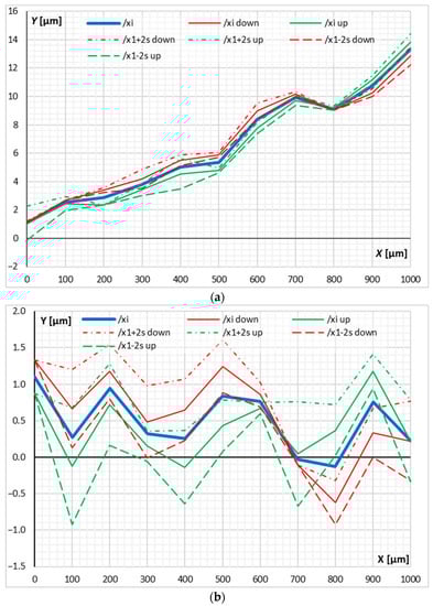 Compensation of the non-linear positioning characteristics of the piezoelectric drive and PLC allowed for significant reduction of errors and improving accuracy (Figure 3b). The polynomial model included in the compensation method facilitated the substantial change in the values of the mean bidirectional positioning error M, systematic positioning error E, and positioning error A, which is presented in Table 1.