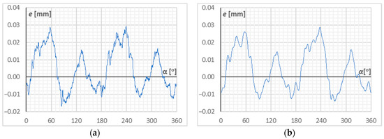 The data obtained from the tool position measurement while turning and the verification measurements of the obtained shapes with the use of the coordinate measuring machine differed not only in terms of the registration method but also in structure (deemed as the method of structuring data in a file) as well as in the number of samples due to different sampling rate and domain (angle and time). The laser transducer recorded the tool position over time during processing at a rate of 2600 samples/s. The resulting data from the coordinate measuring machine constitutes a set of coordinates corresponding to the sample cross-section. In order to compare the results, it was necessary to unify their structure. The first step was to convert the coordinates stored in the measurement files from cartesian into polar coordinates. In the case of the CMM measurements, the angular interval in the polar coordinates was not constant. Therefore, the next step was to oversample the measurements to obtain the same number of measurement points in both data sets. The spline interpolation algorithm was used for this purpose. Then, in order to keep only the harmonics describing the surface waviness in the signal, a digital low-pass filter was applied to the limit frequency equal to fifty times the base harmonic (of the nominal shape). The examples of deviation as a function of angular orientation prior to and after applying the filter for the as-measured contour are presented in Figure 6.