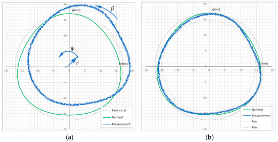 Finally, the results were compared using the best fit algorithm to align the measurement data to the reference considering the measurement contour center displacement by angle ψ and radius r and contour rotation by angle β. The algorithm assumes obtaining the minimum width of the deviation from the nominal profile zone defined as the difference between the largest and smallest deviations. The examples of data prior to and after alignment are presented in Figure 7.