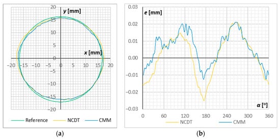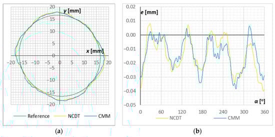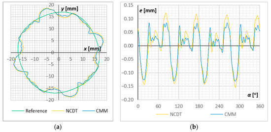 Measurement results for sample no. S1.2: (a) shape deviation e in polar coordinates magnified by 50×; (b) shape offset e in the domain of rotation angle α.