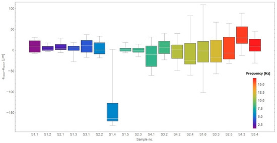 For sample no. S1.4, the tool position recorded by the optical laser NCDT sensor was influenced by a gross error due to the contamination of the sensor face with dirt. These results were excluded from further considerations in this work. The maximum mean shape deviation recorded during the tests amounted to 34.29 µm, its standard deviation amounted to 35.10 µm. The maximum and minimum deviations were 82.86 µm and −60.61 µm, respectively. It can be noticed that variation in differences between both measurement techniques grow with FTS operating frequency when it exceeds 9 Hz, which is the limit operational frequency of the piezoelectric drive.