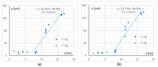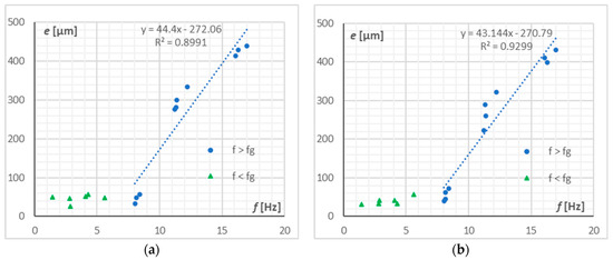 The obtained profile deviation from an ideal shape and the standard deviation from the mean were designated for each measurement series. The data are visualized in the form of two groups. The first, tagged with green triangle markers, includes test results for which the FTS operating frequency did not exceed the limit frequency fg equal to 9 Hz. The second group, tagged with blue circles, includes the results for which the frequency exceeded the limit value. The results are presented in Figure 12 and Figure 13.