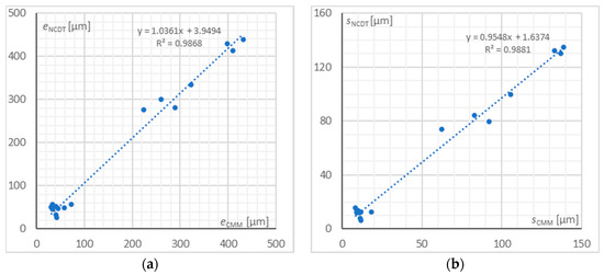 For the FTS drive operating frequency—lower than the limit frequency—the mean values, maximum values, and standard deviation for both the profile deviation and its standard deviation are similar in numbers. Therefore, the determination coefficient R2 was designated for the results obtained using the optical transducer testing the tool position during processing and compared with the results obtained during the coordinate measuring machine test. This test was aimed at checking whether the online tool position measurement during processing can be the basis for a preliminary determination of the obtained profile deviation. The results in the form of a plot are presented in Figure 14.