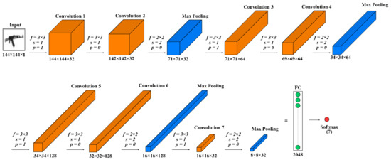 35]. Convolution, pooling, and forgetting processes are repeated with different parameters and different filter channel values in later layers. Then, neurons are formed into an array by flattening and fully connecting layers. As a result of the straightening process, 2048 neurons are obtained by forming a fully connected layer. In the last layer of the model is the classification layer with the softmax activation function. In this layer, the output value is obtained by classifying the number of classes determined in the dataset. As a result of the classification, seven different weapon types take a value in the range of 0–1 and the weapon type with the highest value presents the estimated value.