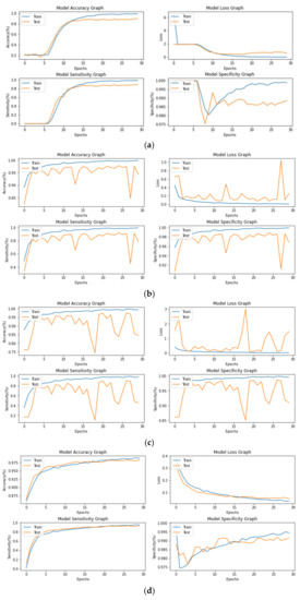 36], and epochs (30) were used the same. The input image size for these four model tutorials was set to 144 × 144 pixels in gray color format. In all four models, “accuracy”, “loss”, “sensitivity”, and “specificity” change graphs determine the success of the network during training, which are shown in