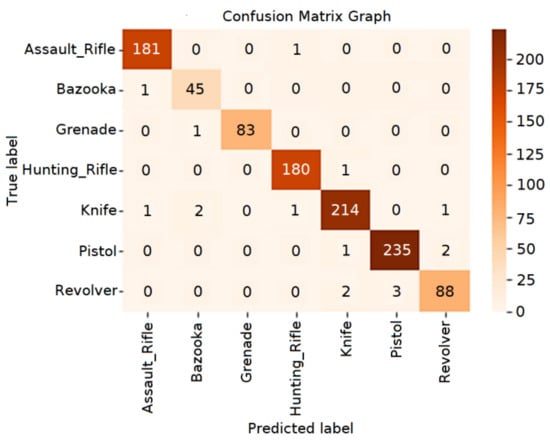The data used in the dataset for the developed model training process were divided into training, validation, and test datasets at certain percentages. In the first stage, the model was trained using the training and validation dataset. In order to test the accuracy of the model trained in the second stage, it was tested using a test dataset that the model could not see and a satisfactory rate of classification success was achieved. In our study, the proposed model identified more types of weapons compared to other studies in the literature. For example, Olmos et al. studied an automatic gun detection system for us in videos for surveillance and control purposes. In this study, the pistol was only detected using a pre-trained VGG-16-based classification model [