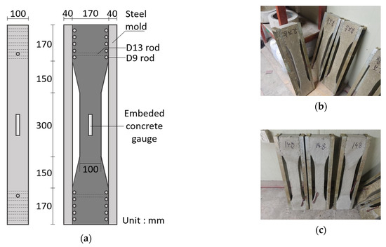 We conducted the restrained drying shrinkage tests in accordance with KS F 2595 [10]. These tests are known to be favorable for evaluating the restrained drying shrinkage characteristics of members with straight-line geometry, such as slab members. Plain concrete and concrete reinforced with an arched steel fiber content of 14.8 kg/m3 (SFRC14.8) were set as variables based on the fiber content. We prepared the specimens using a dumbbell-shaped mold to the size suggested in KS F 2595 [10] and fabricated three samples for each variable (plain and SFRC). Figure 1a shows the size of the specimen and it was restrained with a rebar of D13 at the ends. We embedded a gauge in the center of each specimen to measure the restrained drying shrinkage strain. By connecting the embedded gauge to a data logger, we could measure the strain once per hour. The measurements were taken for 56 days from the day the concrete was poured. Figure 1b shows plain concrete specimens, and Figure 1c shows SFRC14.8 specimens used in the restrained drying shrinkage tests.