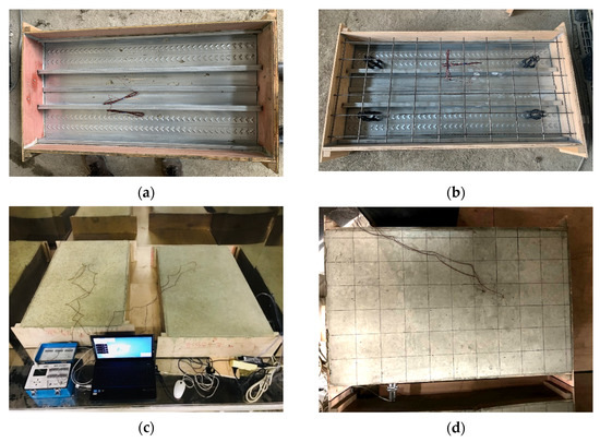 Figure 3 and Figure 4 show the fabricated slab specimens. Figure 3a shows the 620 × 1020 × 150 mm formwork, and Figure 3b shows the deck plate installed at the bottom of the formwork. We then embedded gauges 30 and 70 mm from the top to measure the drying shrinkage strain at the surface and at the center of the deck slab. Figure 4a shows the fishing lines (which were removed after the concrete was poured) that were used to affix the embedded gauges. Figure 4b presents the case of the deck slab reinforced with wire mesh (Φ6 100 × 100 mm) that was installed at the top of the slab prior to concrete pouring using spacers. Figure 4c,d shows the pouring and curing of the concrete, respectively. We exercised caution when pouring the concrete so as not to move or damage the embedded gauges. Dry-curing took place after we covered the poured concrete with vinyl.