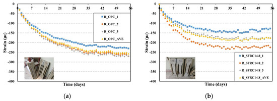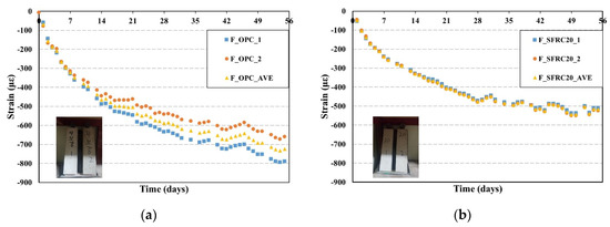 Restrained drying shrinkage strain during aging: (a) plain concrete and (b) concrete reinforced with arched steel fiber content of 14.8 kg/m3.