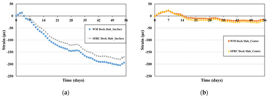 Figure 7 shows the aging results for the drying shrinkage strain measured by the gauges embedded at the surface and at the center of each deck slab specimen. For the surface measurements, the strain increased at the beginning but decreased after three days of aging due to the drying shrinkage of the concrete that occurred on the surface. The tendency of the drying shrinkage strain of the wire mesh deck slab to decrease is similar to that of the SFRC deck slab; however, the drying shrinkage strain of the wire mesh deck slab increased more than that of the SFRC deck slab as the aging progressed. After 56 days of aging, the drying shrinkage strain of the SFRC deck slab at the surface was approximately 12.4% less than that of the wire mesh deck slab. The reason for this outcome may be that the significant concrete drying shrinkage occurred in the part of the wire mesh deck slab that did not contain wire mesh, as only the upper part of the concrete was reinforced with wire mesh, whereas for the SFRC deck slab, the entire cross-section of the concrete was reinforced with arched steel fiber.