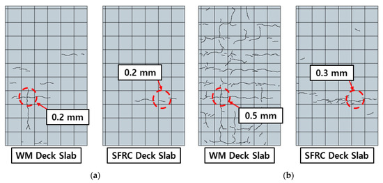 Figure 8 and Table 5 present the crack geometry and widths of the cracks that appeared on the surface of the wire mesh deck slab and SFRC deck slab after aging for seven days and 56 days. Figure 8a shows the crack geometry on the surface of the wire mesh and SFRC deck slabs after seven days of aging. At the beginning, cracks appeared on the surface of both the wire mesh and SFRC deck slabs due to plastic shrinkage. The average crack width is shown to be 0.1 mm, and the maximum crack width is 0.2 mm. Figure 8b shows the crack geometry on the surface of the wire mesh and SFRC deck slabs after 56 days of aging. After 56 days of aging, drying shrinkage cracks appeared on the entire surface of the wire mesh deck slab, with crack widths ranging from 0.1 to 0.5 mm. In the case of the SFRC deck slab, drying shrinkage cracks appeared at the same location as the initial cracks that were due to plastic shrinkage, with crack widths ranging from 0.1 to 0.3 mm. This comparison of the crack geometry and crack width in terms of aging indicates that the SFRC deck slab can inhibit plastic shrinkage cracks that occur early more effectively than the wire mesh deck slab can, and that the SFRC deck slab also is more effective than the wire mesh slab in controlling the number of drying shrinkage cracks and the crack widths.