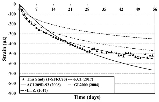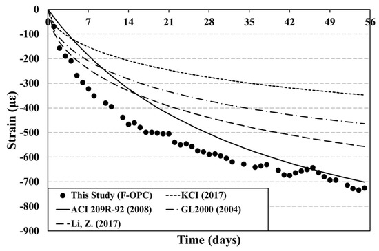 Each prediction model predicts the drying shrinkage strain based on different environmental and material factors. For the F-OPC and F-SFRC20 specimens, we compared the free-drying shrinkage strain results obtained using the prediction models with the test results.