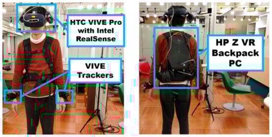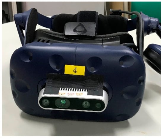 We used the VIVE Pro from HTC as the HMD for VR in our system. An Intel RealSense D435i (hereafter, “RealSense”) was mounted on the front of the HMD as a RGB-D camera for 3D object data generation (Figure 1). The location of a real-world object was calculated from the position and orientation of the HMD, and the depth information was acquired from the RGB-D camera. Then, it was displayed in VR space. The position and orientation of the HMD were determined by using SteamVR Tracking 2.0, which was an outside-in tracking method, and by installing sensors called “base stations” in the outside environment. This system was implemented using the game engine Unity and the Python programming language.