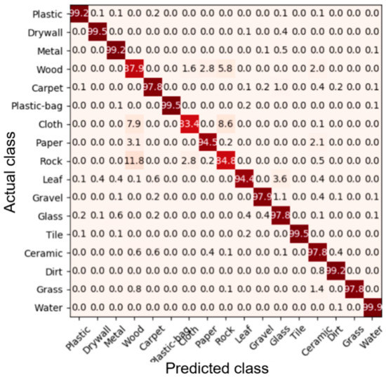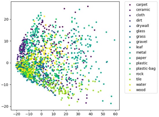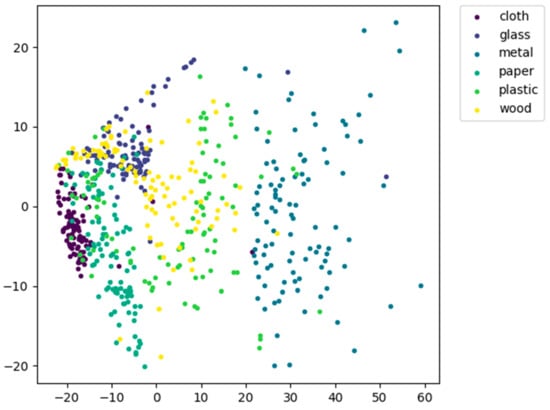 The results in Table 2 include the classified materials in the images from Figure 6, but as we can see, the recognition accuracy deteriorated, because multiple materials were included in the image. Another factor is that the image area, recognized by the object recognition of YOLO v3, included the periphery of the object and was wider than the image of the dataset used in the training.