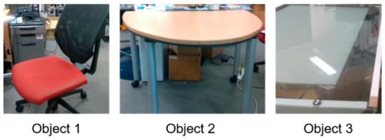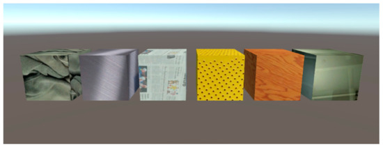 In the actual usage environment, an object was recognized by YOLO v3 [22] from the color image of RealSense worn on the VR headset, and the material was discriminated from the image area of the acquired object, as a result. Therefore, we investigated the accuracy of the material discrimination model, in such a situation. Figure 6 shows an example of the data acquired in the usage environment, and Table 2 lists the accuracy, when the data was recognized, using the trained model. Each item in Table 2 shows the ratio classified into each material, as a result of verifying each object with multiple images.