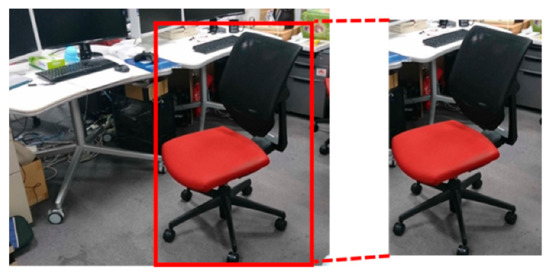 The image identified, by the object recognition above, was displayed in a bounding box that surrounded the entire object, as shown in Figure 7. We found that the recognition accuracy of the material estimation decreases, in the case of an object consisting of multiple components, which indicates that further subdivision of each component from the recognized object is needed. Processing was, thus, performed in the following three steps, for object component segmentation.