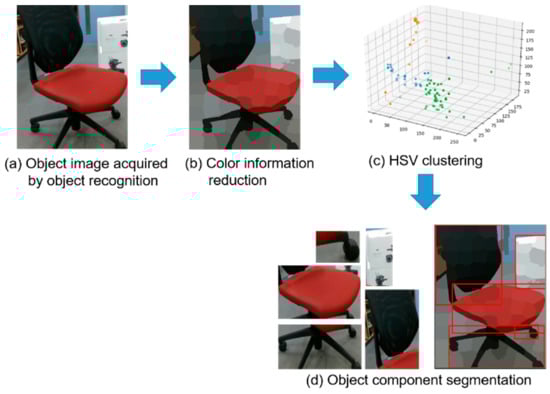 As stated earlier, the objective of this research is to dynamically generate VR content that reflects the real world, and the impact sound, in the VR system that needs to acquire movable objects in real time. For this purpose, it is first necessary to acquire object images. Our object image acquisition is premised on acquisition from the RealSense, attached on the front of the HMD. First, the surface image of the material is acquired by performing object component segmentation using color information. There are also methods of decomposing an object into its components, based on the point cloud [20,21], but in this research, we emphasize real-time characteristics and, thus, adopt a more efficient image-based method.