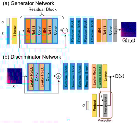 - Miyato, T.; Koyama, M. cGANs with Projection Discriminator. arXiv 2018, arXiv:1802.05637. [Google Scholar]