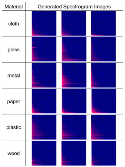 Therefore, it is necessary to create a dataset that collects the sounds of hitting objects of multiple materials in various situations, which is more suitable for the purpose of this research. In addition, we need to make adjustments, so that the sound data collected for creating the dataset can be sufficiently classified by the subjects using the texture images. Our future work will involve the creation of such a dataset, to enable more effective learning by the proposed method.