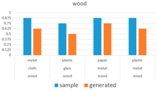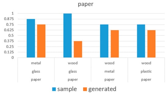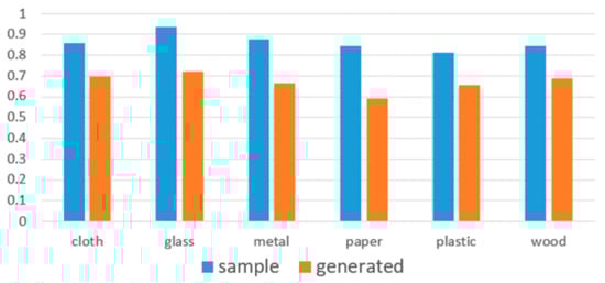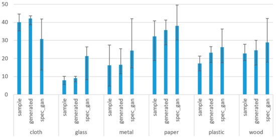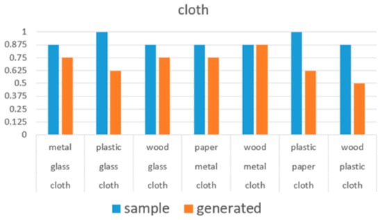 The results showed that the sound data, generated by the proposed method, was evaluated as better than the baseline in all classes, except for the class cloth. Even for paper, which is the class with the worst experimental results (as described in the previous subsection), the sound data generated by the proposed method was closer to the correct answer data than the baseline. In Figure 23, the only sound data in which the evaluation was worse than the baseline was cloth, and the correct answer data also had a worse evaluation than the baseline. Since the values of “sample” and “generated” are close to each other, it is safe to say that the evaluation of the sound data itself is closer to the correct data than the baseline.