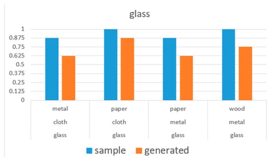 As shown in Figure 19 (glass) and Figure 20 (wood), there was a decrease in accuracy for the combination containing wood and plastic, as well as the combination containing glass and metal. These results were also inferred from the results of the questionnaire survey of the subjects. In addition, paper-wood and cloth-plastic are examples of combinations that were not mentioned in the answers to the questionnaire but that were difficult to distinguish.