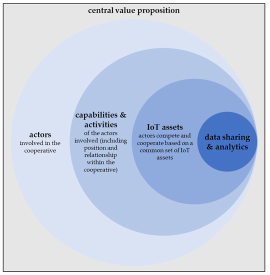 As a global network that enables real-world assets to interconnect, intercommunicate, and interact digitally, the Internet of Things (IoT) is of interest for all industrial domains that deal with physical goods, where manufacturing is prime. IoT technologies allow organizations to automatically generate digital representations of physical objects that can capture their real-world identities, locations, and states (digital objects). The collection, integration, and analysis of such data enable companies to implement new types of services [1]. Examples documented in the literature include predictive maintenance services for machinery and equipment, process mining for determining bottlenecks in complex production environments, fine-tuning of recipes and sequences for process manufacturing [2], optimization of plant availability, energy management, monitoring and analysis of production and logistics processes [3], and new approaches to the management of packaging [4]. The context of most of these scenarios is not an isolated workplace or an individual asset but an environment with a variety of components embedded in large processes. The necessary data for such services can quickly cross company borders [5]. Data are often owned by a multitude of organizations, such as the manufacturing company, provider of (smart) machinery, suppliers of parts and materials, operator of smart sensors, logistics and transport enterprises, possible customers, and more. This entails the necessity for those organizations to cooperate to design innovative, analytics-based business models, such as machinery as a service, production on demand, or asset benchmarking [6,7]. In the academic literature, respective collaborations are discussed under the subject of IoT ecosystems [5]. An IoT ecosystem denotes a community of interacting firms that compete and cooperate using a common set of core assets and digital objects [5].