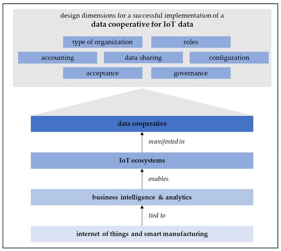 Our research draws heavily from the literature on IoT and smart manufacturing, business intelligence and analytics (BIA), and business and IoT ecosystems. The IoT part introduces concepts for understanding the underlying infrastructure and its connection to the digital (and thereby analytical) world. The data side of the research comes from the BIA literature, which provides insight into building analytical solutions and supporting organizational structures and processes. This includes aspects of the design, implementation, and management of self-contained analytics solutions. Under the term “analytical solution,” we subsume both descriptive (reporting and OLAP, dashboarding) and predictive analytics (mostly with machine learning methods, which themselves are subsumed under the umbrella term artificial intelligence). The areas of business and IoT ecosystems were central to conceptually capturing the economic side of our endeavor and therefore imperative for a holistic view of the subject. Aspects of accounting and pricing turned out to play a central role when data are supposed to be moved to a data cooperative.
