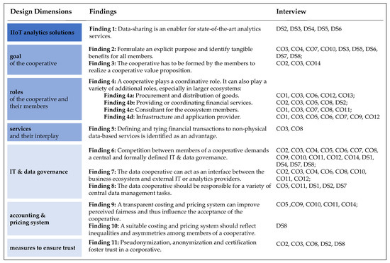 As there is no existing sample of data cooperatives, we decided to collect data from two unconnected samples with different, complementary perspectives: interview series 1, with existing business networks, and interview series 2, with experts in data sharing and analysis. The first series is concerned with the cooperative approach. For the respective insight, we conducted 14 semi-structured interviews with representatives of German cooperatives from a variety of industries (cf. Table 1, left column). The smallest cooperative we interviewed (CO14) had 12 members, whereas the largest cooperative (CO11) had 43,960 listed members; the mean member number was 13,038; thus, our sample included small, medium, and large cooperatives. Although these are not data cooperatives, there is a large area of overlap with the issues they face, particularly with respect to general questions about the organization of a cooperative, questions on how to deal with resource sharing and pricing, and governing a business ecosystem. Some interviewees also brought in experiences with the provision of general IT services and related questions on IT governance. For data sharing and joint analysis, we interviewed eight members of IIoT projects (with two exceptions all coming from the IIC) that all involved data sharing and data analysis across several enterprises (interview series 2). Unlike in the first interview series, the organizations in the second were mostly large companies [54,55].