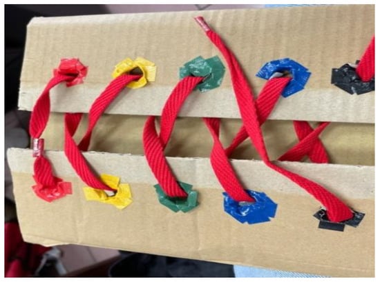 Although educational materials are available in VIB schools, these cannot be customized for the student’s preferences, thus preventing the individualization of special education. An important aspect that has been considered is attracting the interest of the students during personalized education. In a study by Reber et al., the students were introduced to different personalized styles of education: contextual personalization, choice, and active personalization. In their research, it was found that the interest in the lesson of the students in the group taught using individual personalization was increased by solving additional problems from the textbook. This connected the learning material to the personal aspects of their lives. It was also found that, if the students were given a choice to pick between two tasks, their interest was increased, possibly due to the increased autonomy. The situational interest was targeted by the choice of the style of education. Finally, the aspect of active personalization increased the interest of their students by involving them in the creation of the learning materials, which enabled them to connect this to their preferred topics, aspirations, and interests. It was found that this method had more effect on low-confidence students, and increased reengagement and retention of their learning. The situational interest effects were observed in the short term, and the individual interest in learning was promoted in the long term [14]. Subsequently, as we experienced firsthand at the Taichung Special Education School for the Visually Impaired, teachers of the VIB students have made significant advances in terms of creativity to teach concepts. As an example, a teacher constructed an enlarged model of the shoelaces on sneakers, as shown in Figure 1. This implementation of the teachers has highlighted the creativity needed to teach basic concepts to their VIB students. However, these teachers have limited skills and training on using modern technologies, such as 3D printing and 3D modeling. In research conducted by Chen et al. [9], such technologies were shown to improve the methods of teachers.