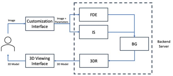 The TacPic system is built using a modular system approach, and passes objects and images onto different modules for each process. Each module within our system conducts a specific task and outputs its result for the next module to use. These modules are also constructed from different programming languages and computing platforms that are integrated with each other. These modules are responsible for the following tasks: Customization Interface, Feature Detection and Extraction (FDE), Instance Segmentation (IS), Braille Generation (BG), 3D Reconstruction (3DR), and 3D Viewing Interface. FDE, IS, BG, and 3DR are included within the backend server. The system infrastructure is shown in Figure 2.