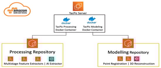 The development of the system was undertaken in a Python environment. The algorithms used were based on the Python implementation within multiple libraries, namely, TensorFlow, OpenCV, and NumPy. The TensorFlow library was used to perform the object detection and instance segmentation on images. The OpenCV library was used to perform the image processing algorithms. Finally, the NumPy library was used for image registration and 3D STL generation. This implementation was applied in the AWS platform for ease of integration with different features. It is beneficial if the algorithm is deployed within a web-based application or a mobile application. Subsequently, the AWS Elastic Container Registry (ECR) was used to store the different algorithms. The algorithms were stored using a Docker container and connected to the AWS Lambda service to enable the container to be run remotely without a dedicated server. Different AWS S3 buckets were used as the storage for the images and STL files used during the testing. The whole process within the AWS platform is shown in Figure 3.