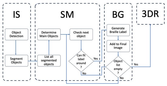 where SS is the final score for the priority, f is the feature (focus, size, location), s is the feature score, ω is the weight for the feature, p is the pixels, and o is the object. This score is then ranked based on the final score to determine which objects are above the score threshold and which is the first to be checked. For each main object, the braille label is checked to determine if it interferes with another object or the boundary of the graphic, and if the object is used for the material. Once all information is checked, it is passed to the 3D reconstruction algorithm.