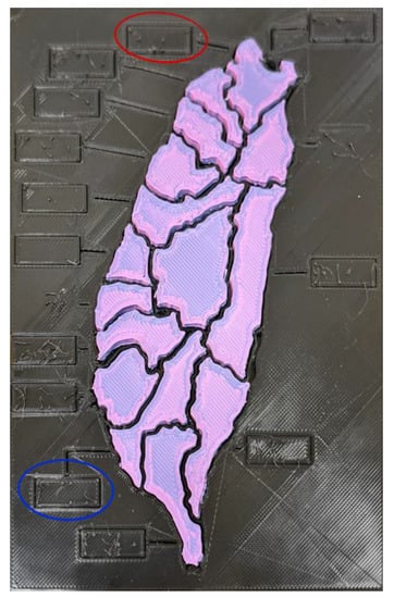 Sample of a tactile map of Taiwan (where the contracted name of each city is used (bei for Taipei City in red, gao for Kaohsiung City in blue, etc.) generated, and 3D printed in Chinese Braille.
