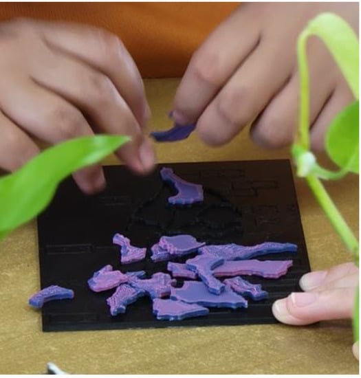 For the tactile maps that were set-up like peg puzzles, the users experienced a slight difficulty in piecing together the Taiwan map. Because the map had a complex shape, the users were initially confused, but were eventually able to place the pieces in their correct slot. With the map base, they were able to locate each Taiwan city using the contracted names of the city (bei for Taipei City, gao for Kaohsiung City, etc.) and also relative to each other. They found that this was an interesting tool to understand geography and the location of each city relative to the others. Images of students using the tactile materials are shown in Figure 9.
