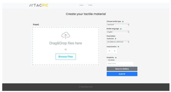 The usability test for the generation website was conducted with the counselling teachers. Their task was to generate a tactile material using a 2D image with the TacPic website. They were then interviewed about their experience and asked for comments on the system. Based on the ISO/IEC 25010:2011 Systems and software engineering—Systems and software Quality Requirements and Evaluation (SQuaRE) quality models, the usability of a system can be determined based on the following sub-characteristics: appropriateness, recognizability, learnability, operability, user error protection, user interface aesthetics, and accessibility. Regarding the aspect of usability evaluation, the most widely used method is the empirical method, consisting of either questionnaires or usability testing which has the advantage that the feedback of the users is directly provided.