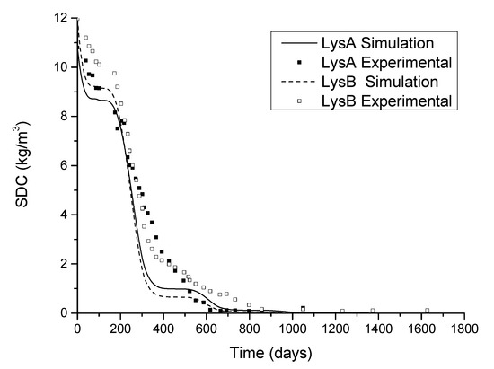 The temperature of the lysimeters showed annual fluctuations with peak-like profiles. The minimum, average, and maximum ambient temperatures were −2.0, 16.7, and 37.0 °C, respectively. Within 300 days, the SDC degraded rapidly and reached a very low concentration, after which it continued to slowly decrease. During the first 100 days, the SDC degraded especially quickly due to suitable temperatures and the high concentration of organic matter. Due to a drop in the ambient temperature, the microbial activity was inhibited, and the degradation slowed between 100 and 200 days. After 200 days, the temperature rose, and the degradation rate once again increased. After 400 days, the SDC concentration was very low and the degradation was slow, but with the continuous oxygen supply the SDC continued to decrease. There was no significant difference in the degradation rates of the two lysimeters (Figure 7).