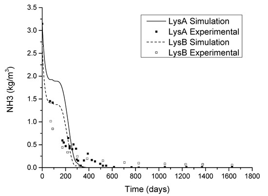 Time profiles of NH3 degradation (experimental data cited in [37]).