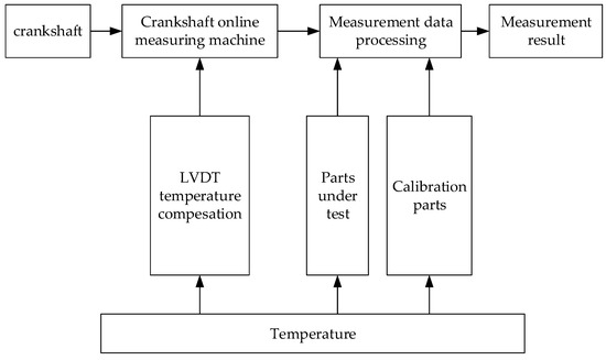 The temperature compensation in the crankshaft online measurement process should be considered from the perspective of the entire measurement system. It is not enough to compensate the error caused by the LVDT sensor. Therefore, the integrated temperature compensation method is designed in this paper, and the temperature compensation block diagram is shown in Figure 1.