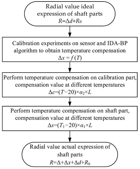 Crankshafts are measured in workshop where temperature changes will not only affect the measurement accuracy of the displacement sensor itself but also cause the thermal expansion and contraction of the workpiece, and will bring great errors to measurement results. The comparison method is used for shafts parts in measurement. The radial value of main journal to be measured is calculated by using the radius value of calibration part and the displacement difference of LVDT probe. The indication value of calibration part is measured in a normal temperature environment. In the workshop environment, the sensor will be affected by temperature, which will cause measurement errors. At the same time, the measurement data of crankshaft and the calibration part will also be influnced by temperature because of the temperature characteristics of their material. The flow chart of the temperature compensation for the crankshaft measurement system is shown in Figure 2.