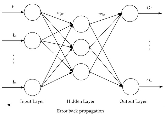 The basic structure of the BP neural network is the input layer, hidden layer, and output layer. Input layer accepts the training data set; hidden layer maps the input data to the output layer through connection weights and activation functions; output layer linear-combine the outputs of hidden layer to computes the predicted result. Figure 5 is a representation diagram of BP neural network structure. In Figure 5, I1, I2,…, In are the input values of the BP neural network, wpk and wkq are the weight relationships of the BP neural network, and O1, O2,…, Om are the expected output values of the BP neural network.