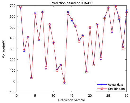 Firstly, the calibration experiment is carried out in combination with the temperature sensor in the range of +5 °C~+60 °C. Then the displacement measured by the displacement sensor, the temperature measured by the temperature sensor and the output voltage of the temperature sensor are used as input, and the output voltage of the displacement sensor is used as the output. Finally, the IDA-BP model proposed in this paper is used to train 90 sets of measured data, and 30 sets of data are used for prediction. Temperature compensation is taken into the displacement sensor. The prediction results are shown in Figure 7.