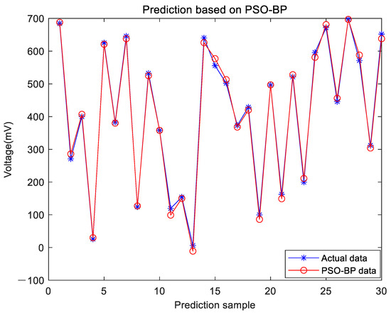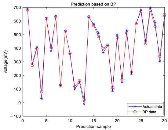 In order to prove the advantage of this algorithm proposed in this paper, comparisons are taken with the conventional BP neural network and the PSO-BP neural network. The prediction results based on BP are shown in Figure 8 and the prediction results based on PSO-BP are shown in Figure 9.