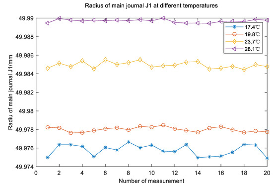 An experiment was carried out according to the temperature compensation method mentioned in Section 3. To improve the accuracy of the measurement system, 20 repeated measurements at 4 different temperatures were performed on the crankshaft measuring machine. The main purpose is to get temperature compensation value of calibration part and workpiece to be measured. The materials used for the crankshaft and calibration part are all 45# steel, and the thermal expansion coefficient is 11.59 × 10−6/°C. The error Δ can be obtained according to Formula (6). In this way, the compensated part diameter can be obtained.