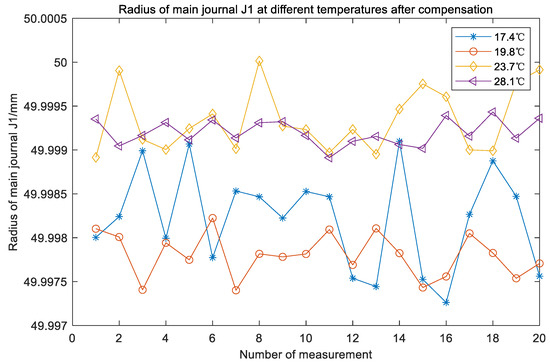 Before temperature compensation, it can be found that the radius value of the main journal J1 measured at different temperatures is different. Obviously, affected by temperature, the error range of the measured value with the same workpiece is relatively large at different temperatures. When the ambient temperature is 17.4 °C, the measured value of crankshaft main journal J1 radius is smallest, which is 49.9744 mm. When ambient temperature is 28.1 °C, the measured value of crankshaft main journal J1 radius is biggest, which is the maximum value 49.9900 mm. The error range is 0.0156 mm. After temperature compensation, measured radius value range is 49.9972 mm~50 mm. The error range is significantly reduced, that is 0.0028 mm. The measurement fluctuation is relatively small, and it is closer to the radius value of the main journal J1.