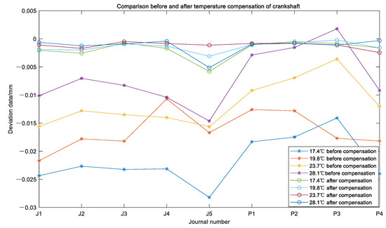 On this measuring machine, the crankshaft main journal and connecting rod journal are measured at the same time. So this temperature compensation method is applicable to all main journals and connecting rod journals of the crankshaft. The deviation values before and after temperature compensation are shown in Figure 14.