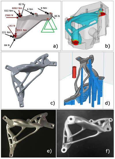 (a) Original geometry of the automotive bracket (box dimensions 135 × 80 × 65 mm): the two superimposed static load cases are shown by red and black arrows, the constraints are schematized by the green triangles in fixed points. (b) Geometry resulting from the TO of the bracket. (c) Final geometry of the stock part with the three appendices added for clamping. (d) Industrialized stock part. (e) Stock part after LPBF, support removal and shot peening. (f) Finished workpiece after machining.