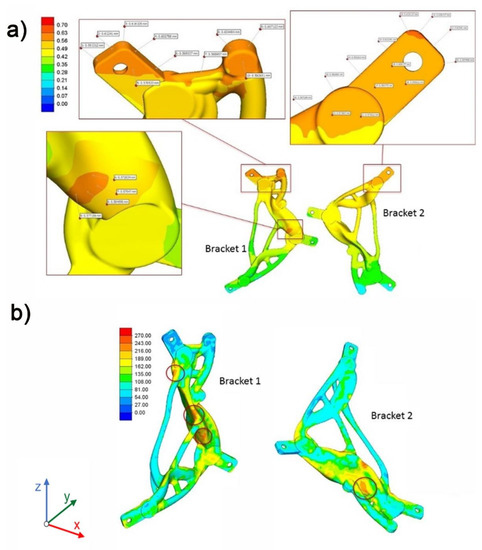 (a) Displacement (in mm) and (b) Von Mises stress (in MPa) distributions for the two relative orientations, Bracket 1 and Bracket 2, under exam. The orientation of the parts can be identified by the coordinate system at the bottom of the figure.