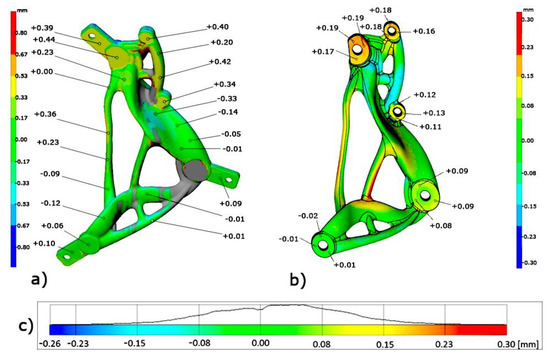 Figure 3a shows the results of the dimensional control of the component still connected to the platform. It can be observed that dimensional errors range from −0.6 to 0.5 mm. Grey zones are due to support structures that hide such areas from the optical scan [32]. Figure 3b shows the dimensional deviation of the finished part as compared to the CAD file. Figure 3c presents a histogram of the distribution of geometrical deviation. All the tolerance constraints were fulfilled on the finished part since the highest deviation was 0.34 mm, whereas the average deviation was as low as 0.065 mm. Interestingly, the maximum deviation measured on relevant surfaces, where the part is assembled with the nearby components, was just 0.19 mm.