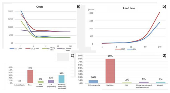 Figure 5 groups the results of the cost and time analysis. In particular, the graphs in Figure 5a compare the variation in the cost per part as a function of the production volume for the first order and for the following reorders. For both production methods, the cost per part quickly decreases for increasing production volumes. In particular, if LPBF is considered, nesting is fundamental in order to exploit as much as possible the volume of the build chamber [33]. However, due to space limits, the SLM 280 machine used here cannot contain more than 12 brackets at the same time. For this reason, the cost per part decreases very quickly from 1 to 12 nested parts, but for larger batches, the cost remains substantially unchanged. In general, LPBF is economically more convenient than CNC. In fact, unless a single part must be produced, the total cost by CNC is systematically higher than by LPBF and becomes 85% higher for batch volumes larger than 12, where all the curves become substantially constant. Interestingly, this means that, although the aluminum bracket was redesigned according to a function-driven design strategy that gives priority to the part performance rather than to cost benefits, LPBF remains economically advantageous over CNC provided that more than a single part is produced [34]. For reorders, all costs are markedly inferior as compared to the first order. In this case, CNC is particularly advantageous for small batches, with a cost curve that is almost constant and that shows the break-even point with LPBF at four units.